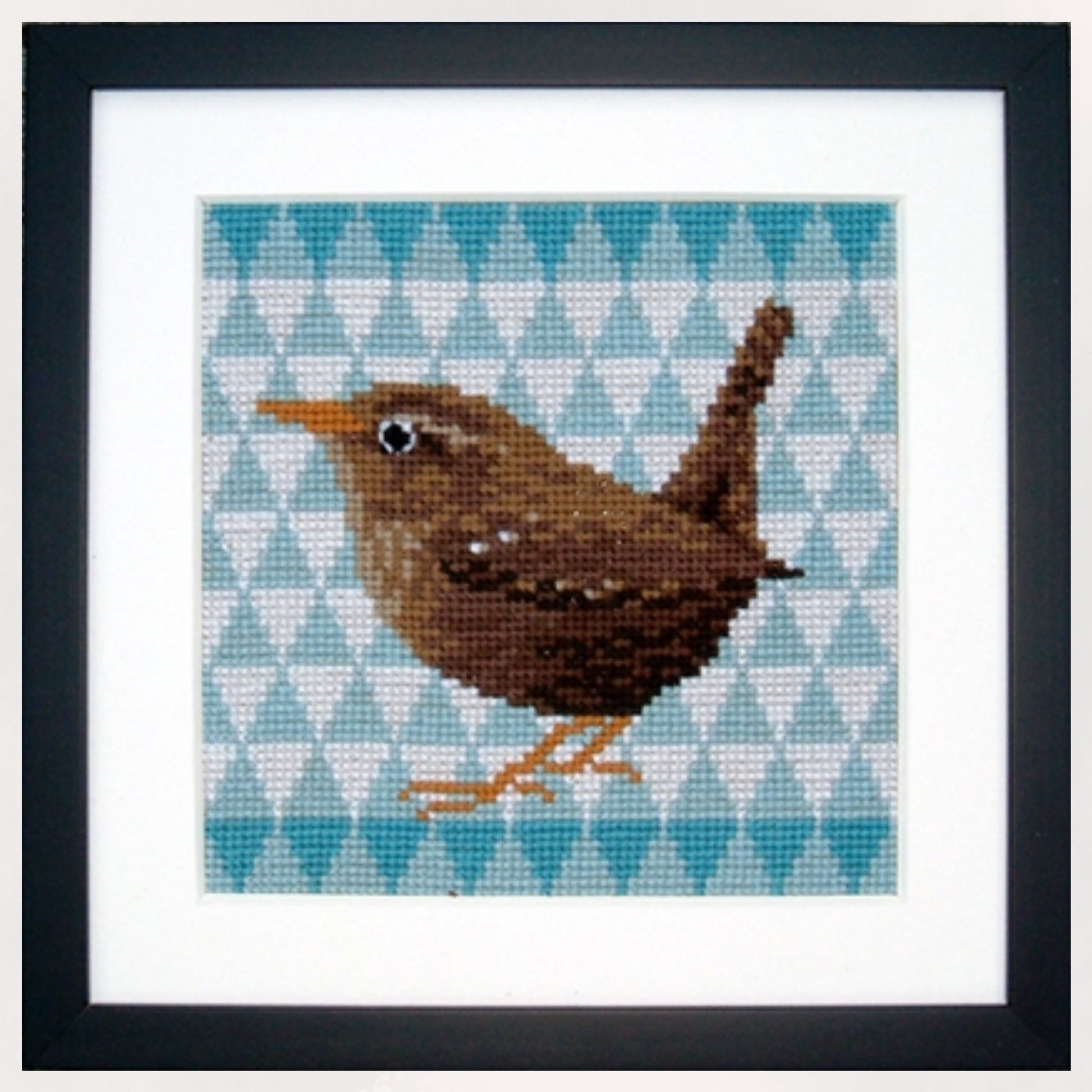 Det fine broderikit "gærdesmutte" indeholder alt du skal bruge for selv at kunne brodere - farvelagt mønster med symboler, stramajstof, garn og to nåle.