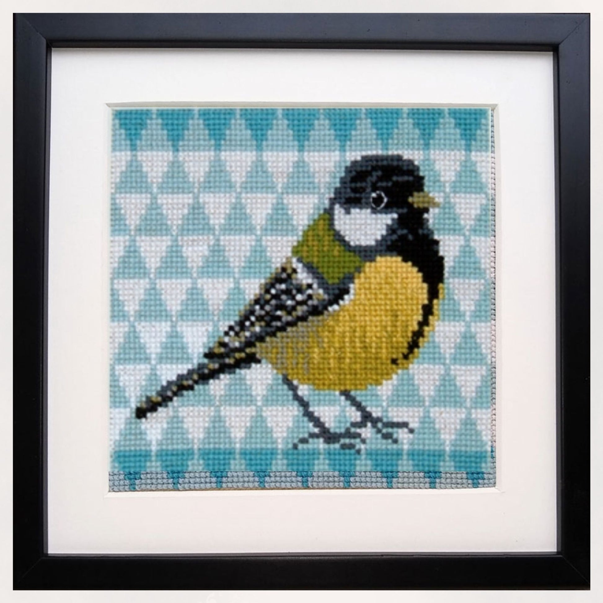 Det fine broderikit "musvit" indeholder alt du skal bruge for selv at kunne brodere - farvelagt mønster med symboler, stramajstof, garn og to nåle.