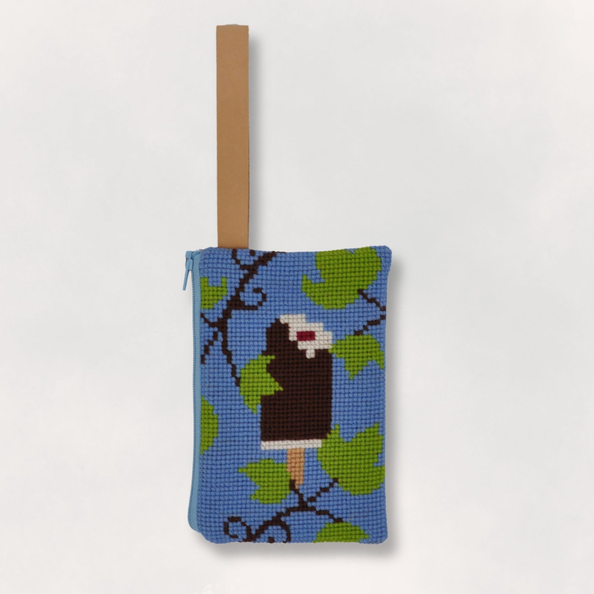 Det fine broderikit "polar pung" indeholder alt du skal bruge for selv at kunne brodere en fin pung - farvelagt mønster med symboler, stramajstof, garn, lynlås, læderstrop, stof og to nåle.